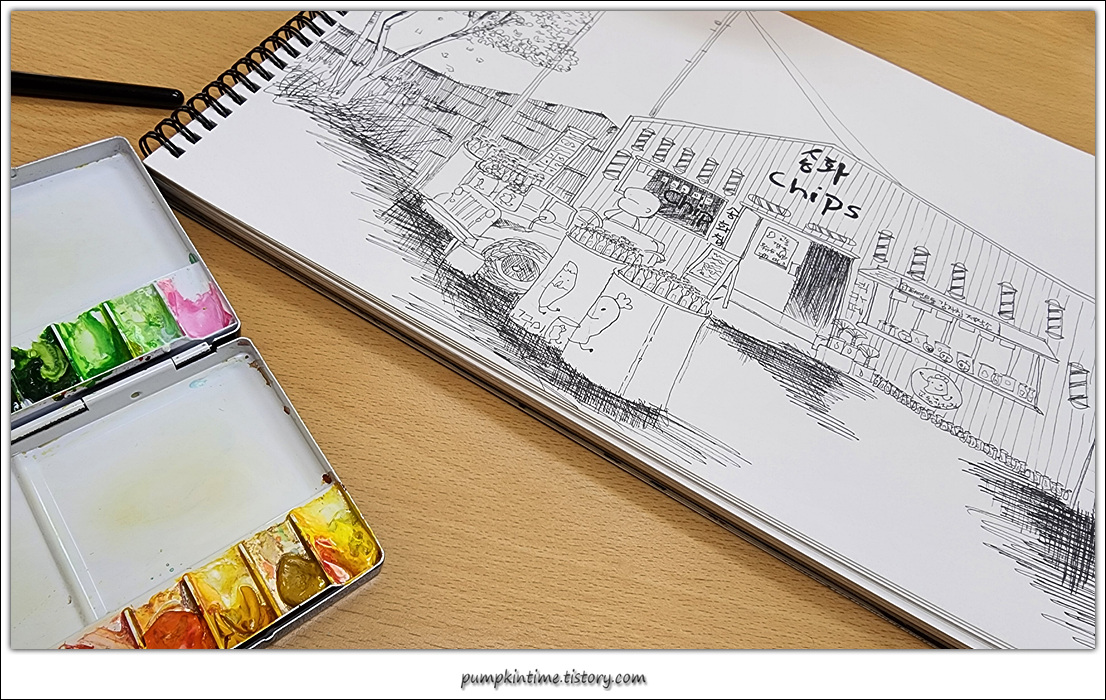 어반스케치를 표현하기엔 초보 실력인 나는 더 나은 모습을 위해 오늘도 한 장 더 채워본다.