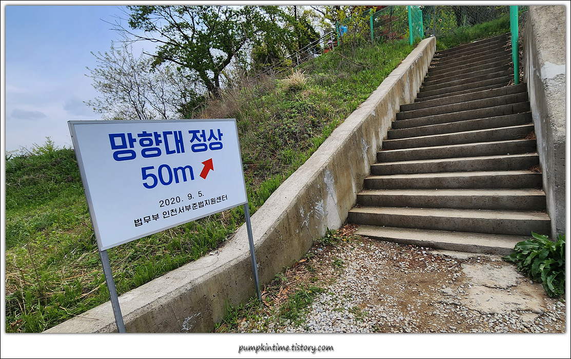 주차 후 이정표 '망향대 정상 50m'.
